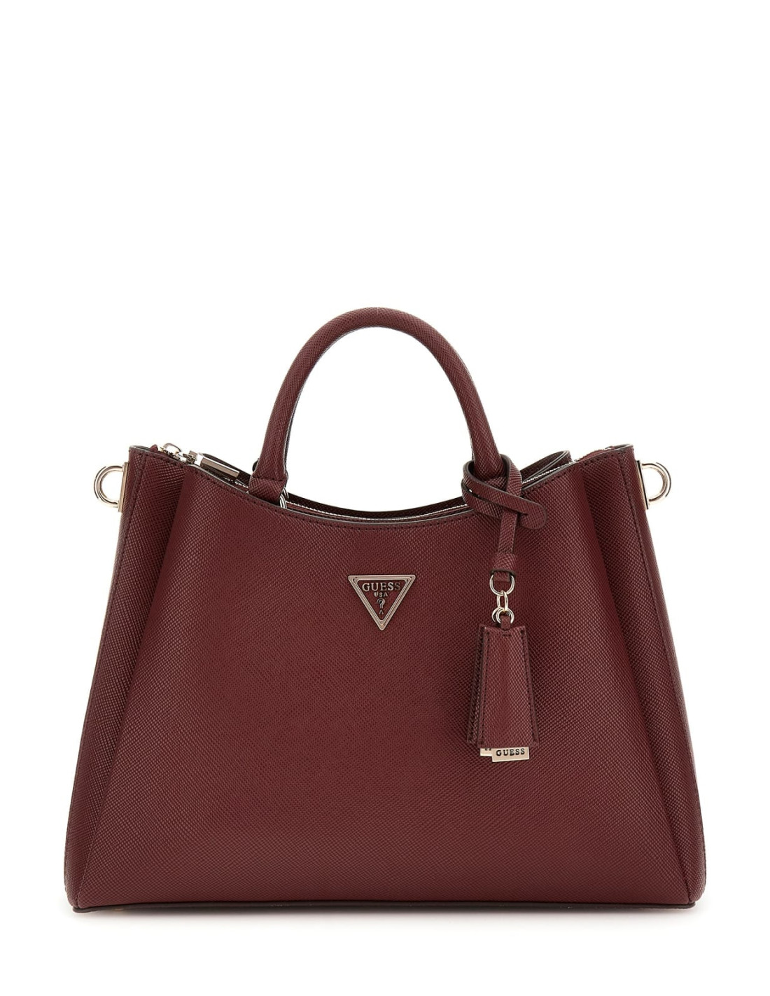 Lavorata in saffiano, charm con logo removibile alla base del manico.