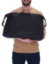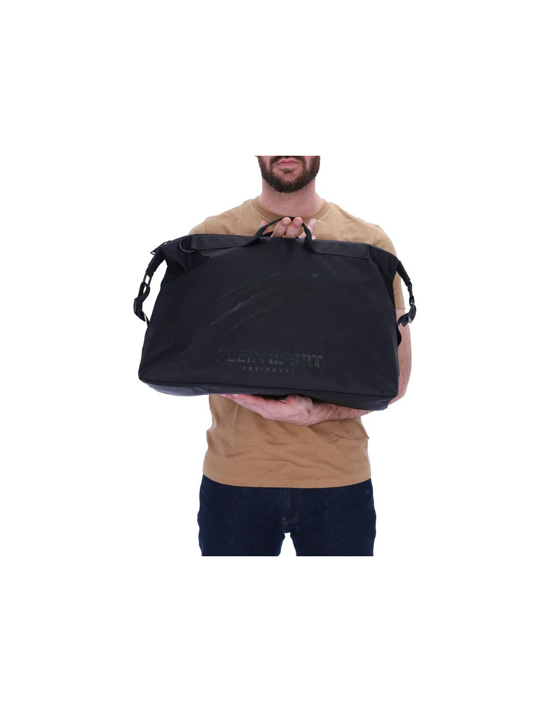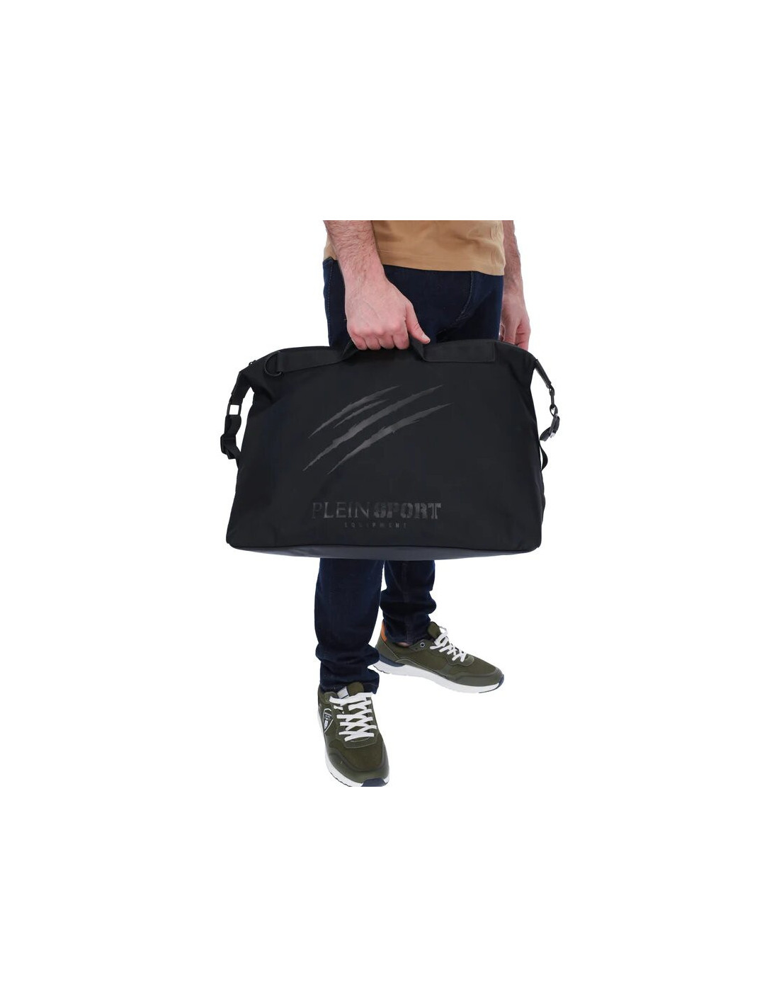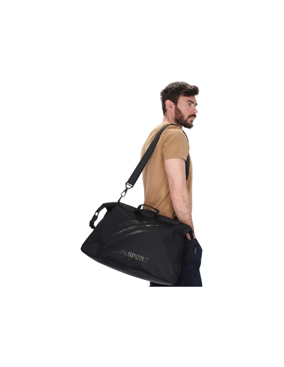 Borsone in tessuto nero con stampa e logo frontale. Due manici e tracolla in tessuto regolabile e removibile.