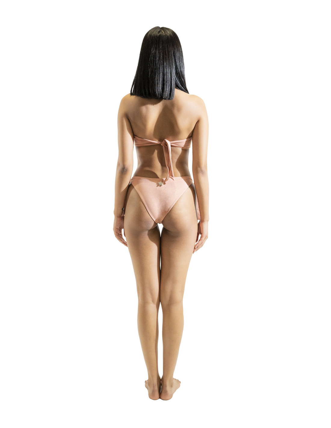 Costume con lavorazione lurex a fascia con coppe, chiusura con fiocco sul retro.
