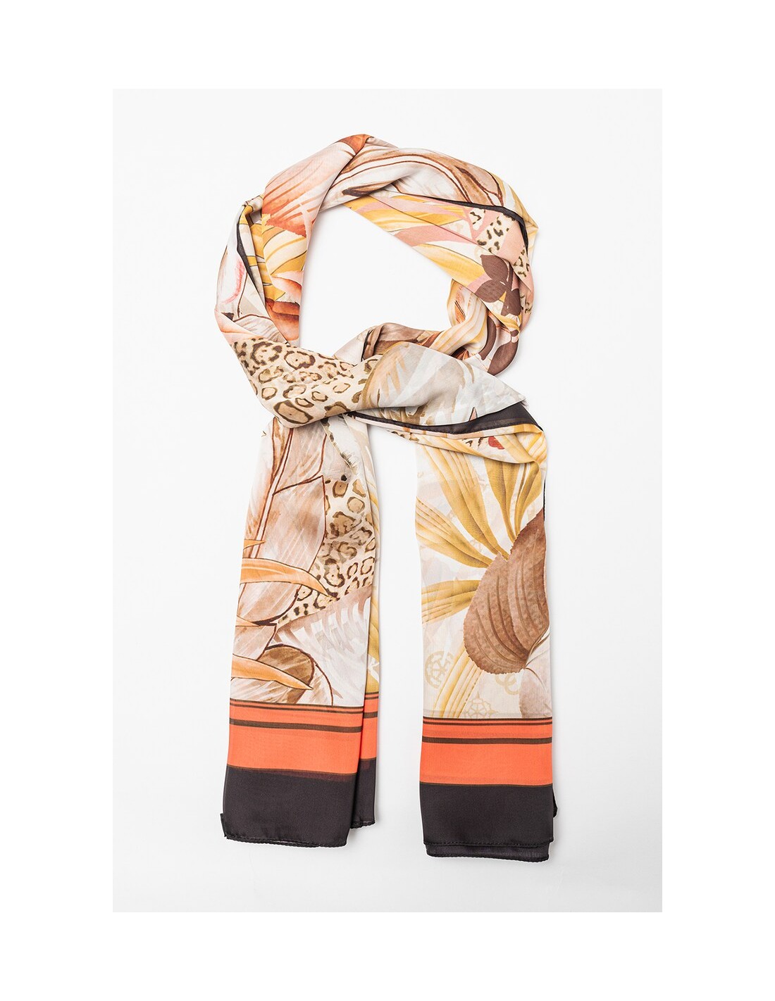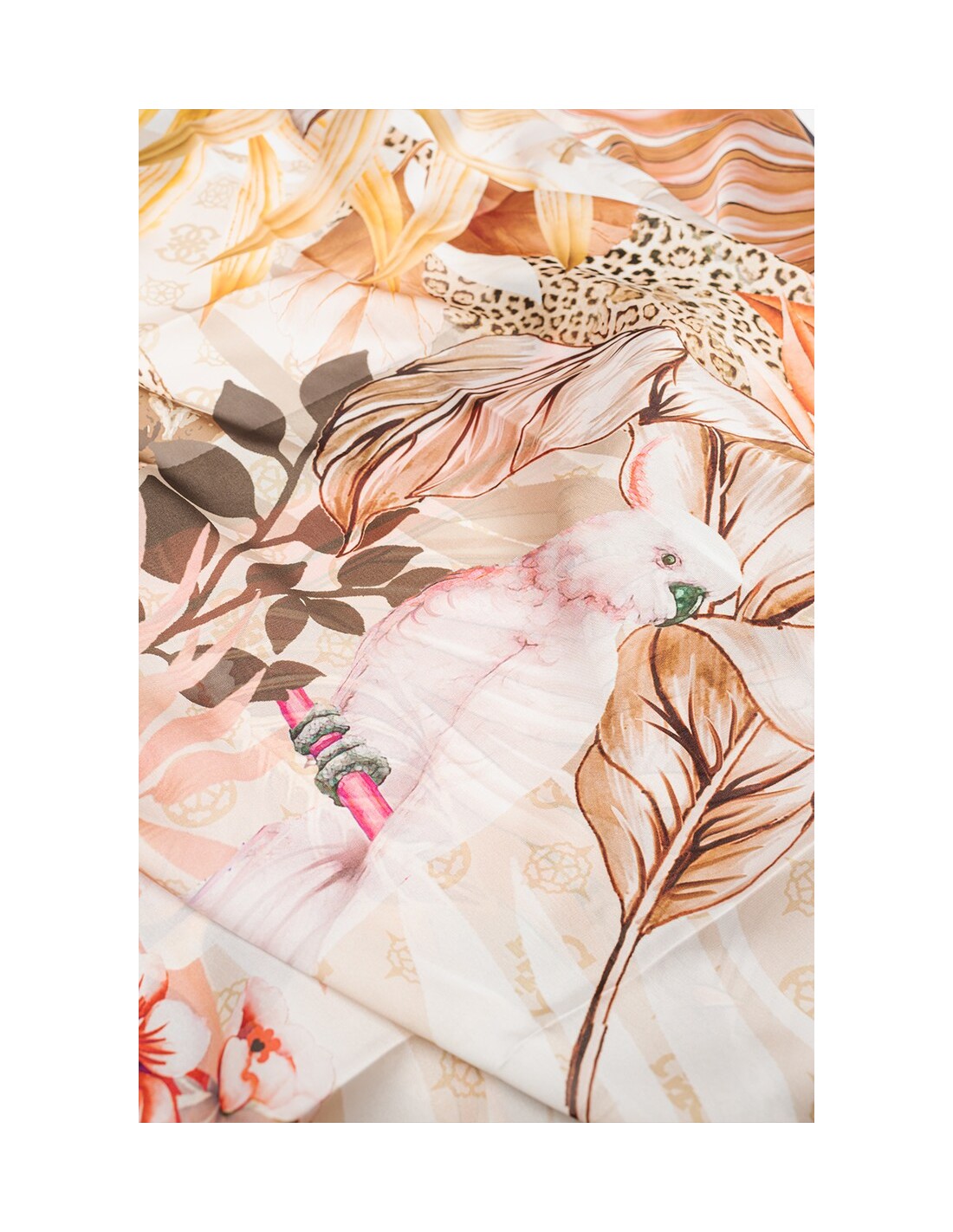 Foulard in tessuto setato stampa floreale con leoni e pappagalli e dettagli animalier.