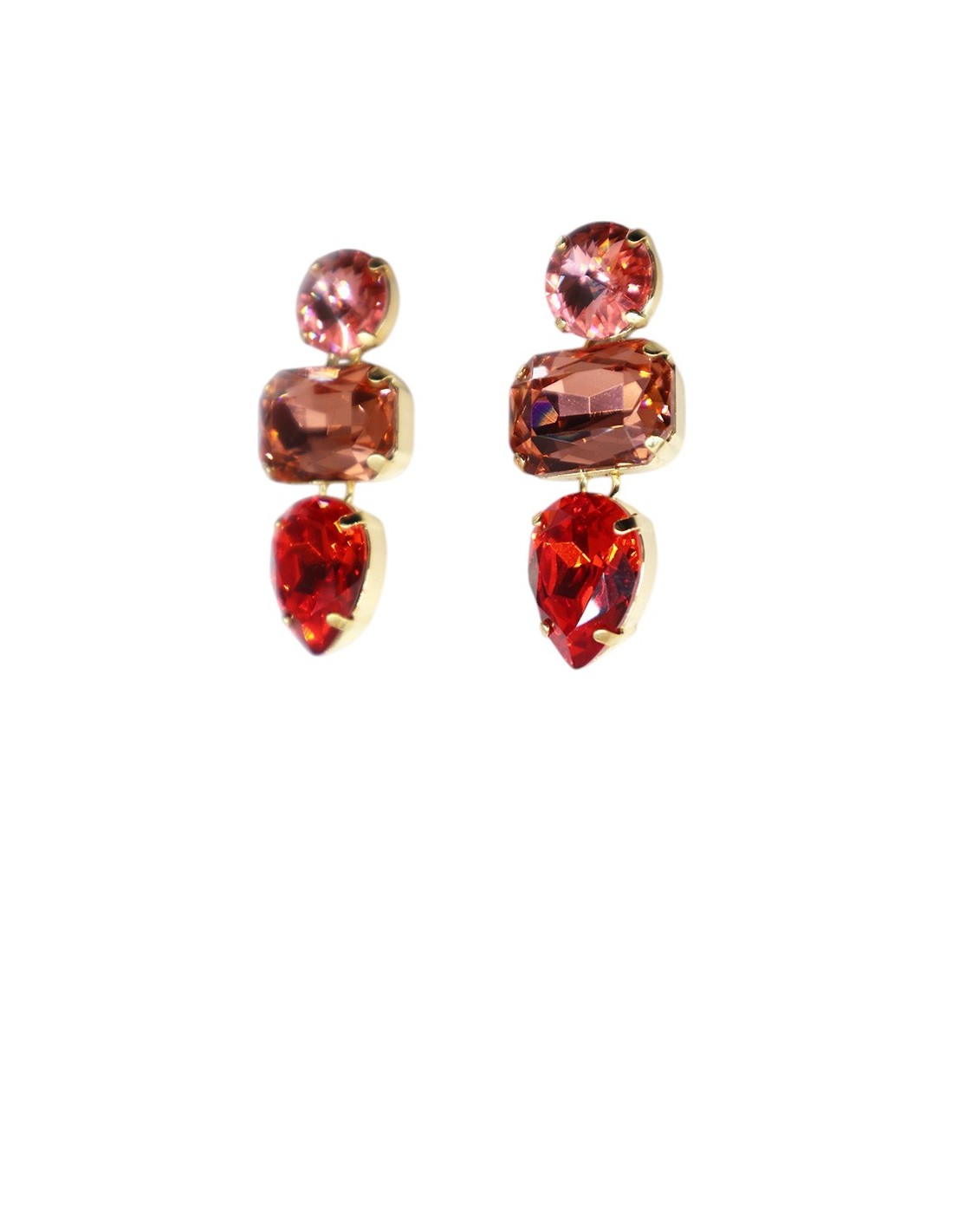 Orecchini con tris di pietre in swarovski e galvanica dorata, lunghi 4cm. Realizzati 100% made in Italy.