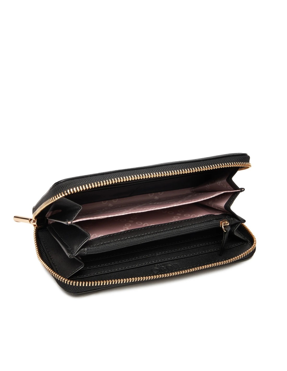 Slots per carte di credito, scomparto per banconote e portamonete interno con zip.