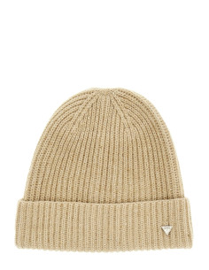 Lavorazione a maglia a costine con filo lurex e logo a triangolo in metallo.